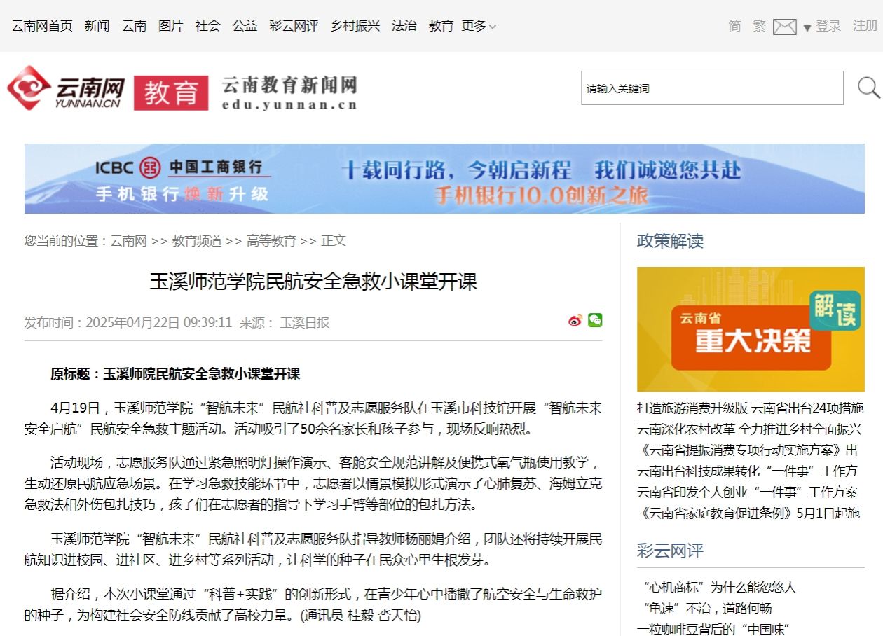 4月19日,玉溪师范学院“智航未来”民航社科普及志愿服务队在玉溪市科技馆开展“智航未来 安全启航”民航安全急救主题活动。活动吸引了50余名家长和孩子参与,现场反响热烈。