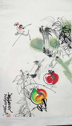 在创作中,他注重色彩微差的运用,或者把草书的表现形式融入石榴绘画中。“草书线条变化无穷,丰富多彩。将草书的激情和严谨在画面中展现,能让画面松弛有度,既有精神内涵,又符合科学性,给人一种舒适感或生命力度感。线条的无穷变化、色彩的冷暖反差和色调的不同处理方式,都能创作出多种多样的石榴绘画作品。所以,我常常会在一幅画没画完时,就迫不及待想画下一幅。”张汉东说。