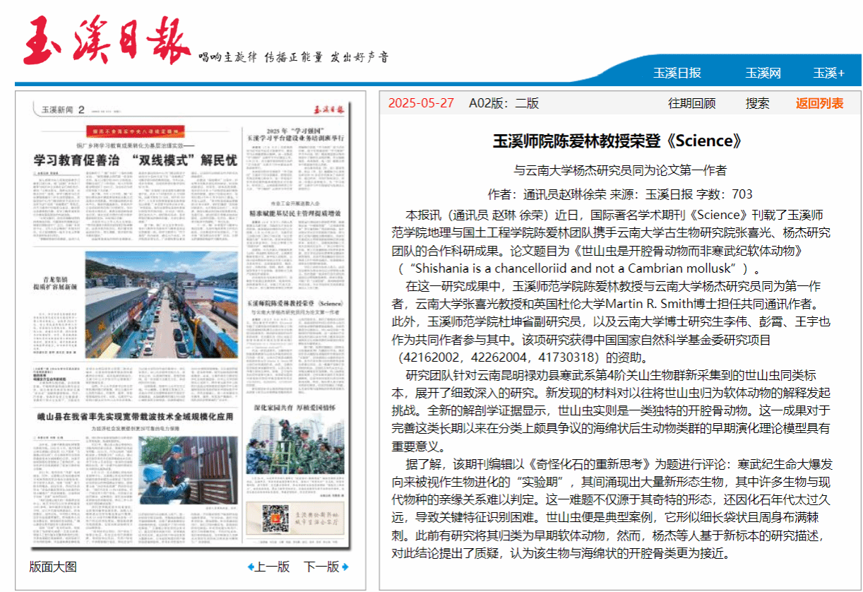 本报讯(通讯员 赵琳 徐荣)近日,国际著名学术期刊《Science》刊载了玉溪师范学院地理与国土工程学院陈爱林团队携手云南大学古生物研究院张喜光、杨杰研究团队的合作科研成果。论文题目为《世山虫是开腔骨动物而非寒武纪软体动物》(“Shishania is a chancelloriid and not a Cambrian mollusk”)。