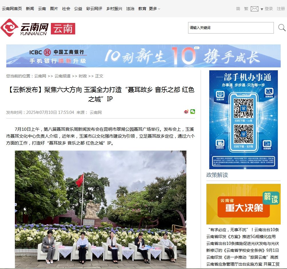 7月10日上午,第八届聂耳音乐周新闻发布会在昆明市翠湖公园聂耳广场举行。发布会上,玉溪市聂耳文化中心负责人介绍,近年来,玉溪市以文化强市建设为引领,立足聂耳故乡定位,通过六个方面的工作,打造好“聂耳故乡 音乐之都 红色之城”IP。