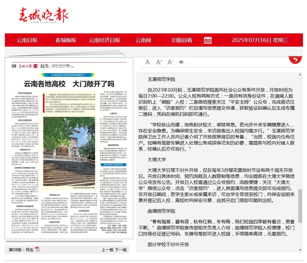 “学校依山而建,地势起伏较大,坡陡弯急。若允许外来车辆随意进入,存在安全隐患。为确保师生安全,来访游客出入校园均需步行。”玉溪师范学院保卫处工作人员向记者介绍了开放政策背后的考量,“当然,校园内也有住户。如确有驾驶车辆进入处理公务或探亲访友的必要,需提前与校内对接人联系,经确认后方可放行。”