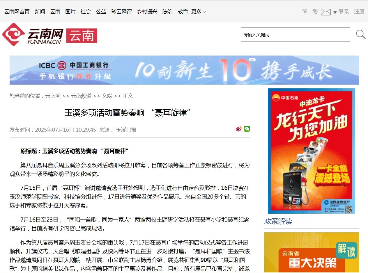 作为第八届聂耳音乐周玉溪分会场的重头戏,7月17日在聂耳广场举行的启动仪式筹备工作进展顺利。升旗仪式、大合唱《歌唱祖国》及快闪等环节正在进一步对接打磨。“聂耳和国歌”主题书法作品邀请展同日在聂耳大剧院二楼开展。市文联副主席杨勇介绍,展览共征集到90幅以“聂耳和国歌”为主题的精美书法作品,内容涵盖聂耳的生平事迹及其作品。目前,所有展品已布置完毕,诚邀市民前来参观。