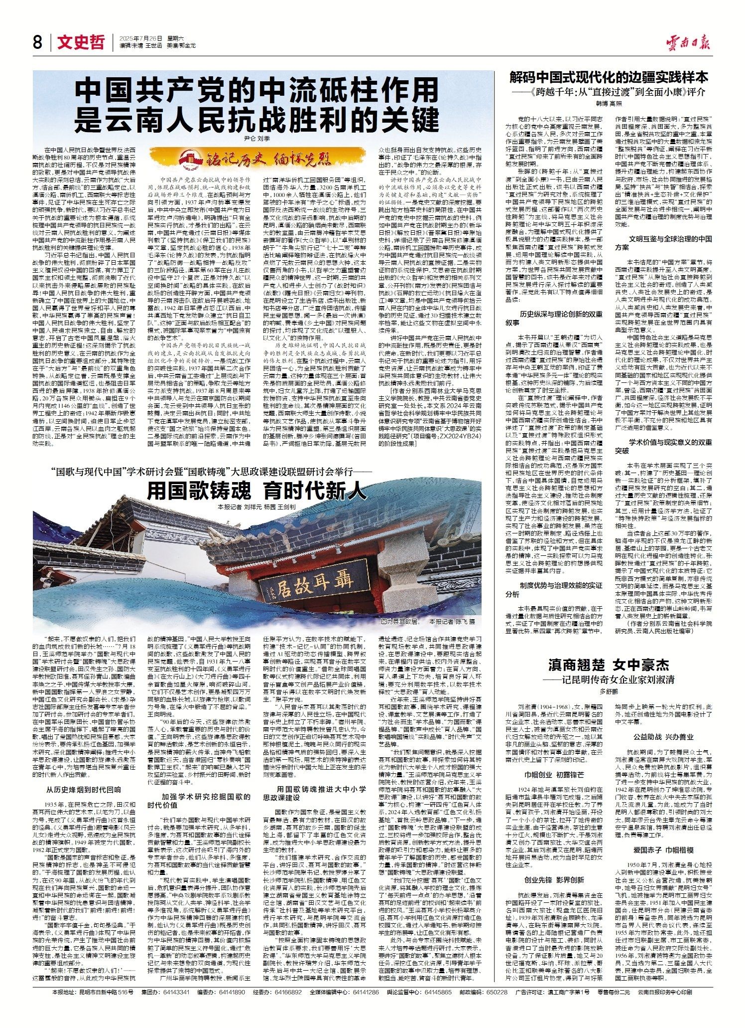 “起来,不愿做奴隶的人们,把我们的血肉筑成我们新的长城……”7月18日,玉溪师范学院举办“国歌与现代中国”学术研讨会暨“国歌铸魂”大思政课建设联盟研讨会。田汉先生之孙、国防大学教授欧阳维,聂耳侄孙青山,国歌编曲李焕之之子、中国传媒大学教授李大康,新中国国歌指挥第一人罗浪之女罗静,中国红色文化研究会副会长、《求是》杂志社国际部原主任杨发喜等专家学者参加了研讨会。参加研讨会的专家学者们,在中国军乐团原团长、中国音协管乐协会主席于海的指挥下,唱起了嘹亮的国歌,唱出了爱国热忱和民族自豪感。大家纷纷表示,要传承弘扬红色基因,加强学术研究,深化国歌精神阐释;推进大中小学思政课建设,让国歌的旋律永远激荡在青年心中,为培养堪当民族复兴重任的时代新人作出贡献。