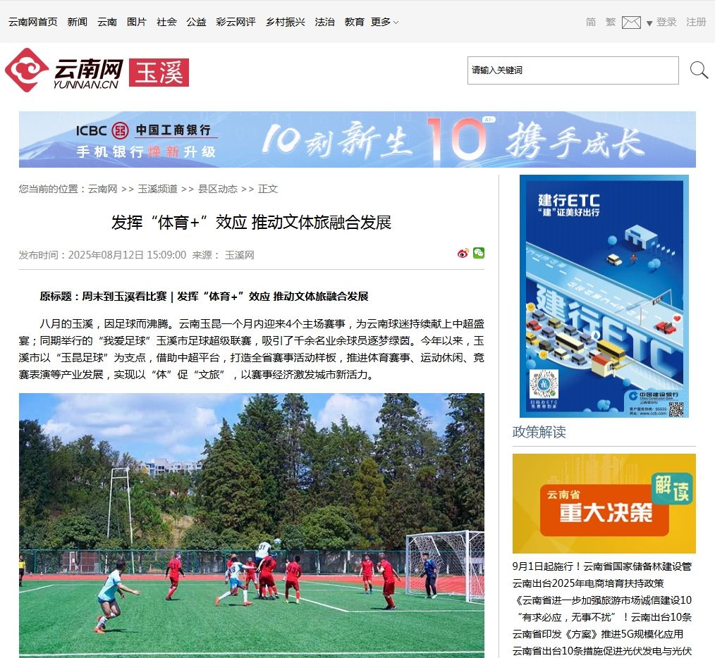 八月的玉溪,因足球而沸腾。云南玉昆一个月内迎来4个主场赛事,为云南球迷持续献上中超盛宴;同期举行的“我爱足球”玉溪市足球超级联赛,吸引了千余名业余球员逐梦绿茵。今年以来,玉溪市以“玉昆足球”为支点,借助中超平台,打造全省赛事活动样板,推进体育赛事、运动休闲、竞赛表演等产业发展,实现以“体”促“文旅”,以赛事经济激发城市新活力。