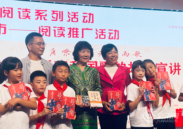 活动让红色种子在孩子们心中生根发芽,在舞台上绽放出绚丽的花。座谈结束后,来自五华区红旗小学、云南师范大学附属小学、云波小学的学生代表身着整齐的校服,精神抖擞地登上舞台。他们深情朗诵《号角》节选篇章,清澈响亮的声音在夜空中久久回荡。