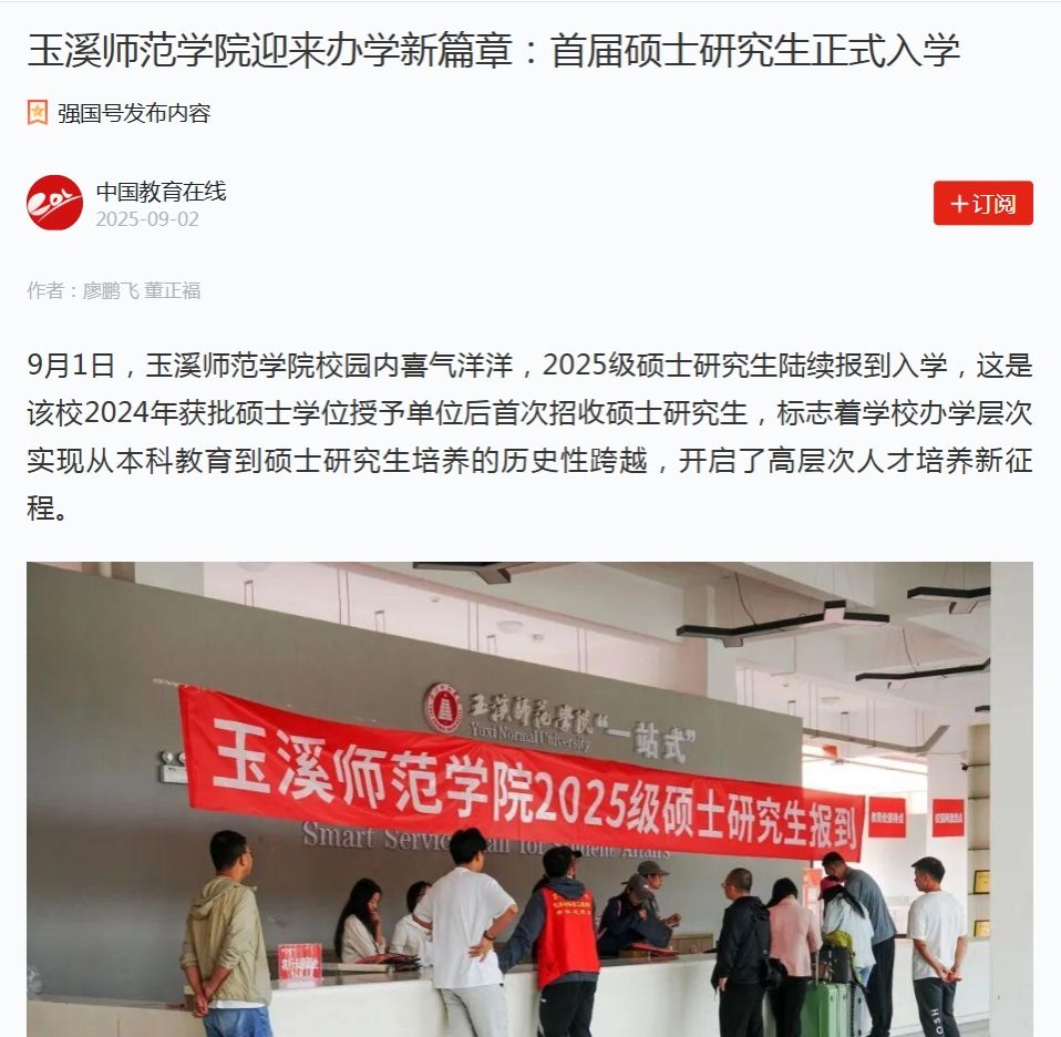 9月1日,玉溪师范学院校园内喜气洋洋,2025级硕士研究生陆续报到入学,这是该校2024年获批硕士学位授予单位后首次招收硕士研究生,标志着学校办学层次实现从本科教育到硕士研究生培养的历史性跨越,开启了高层次人才培养新征程。