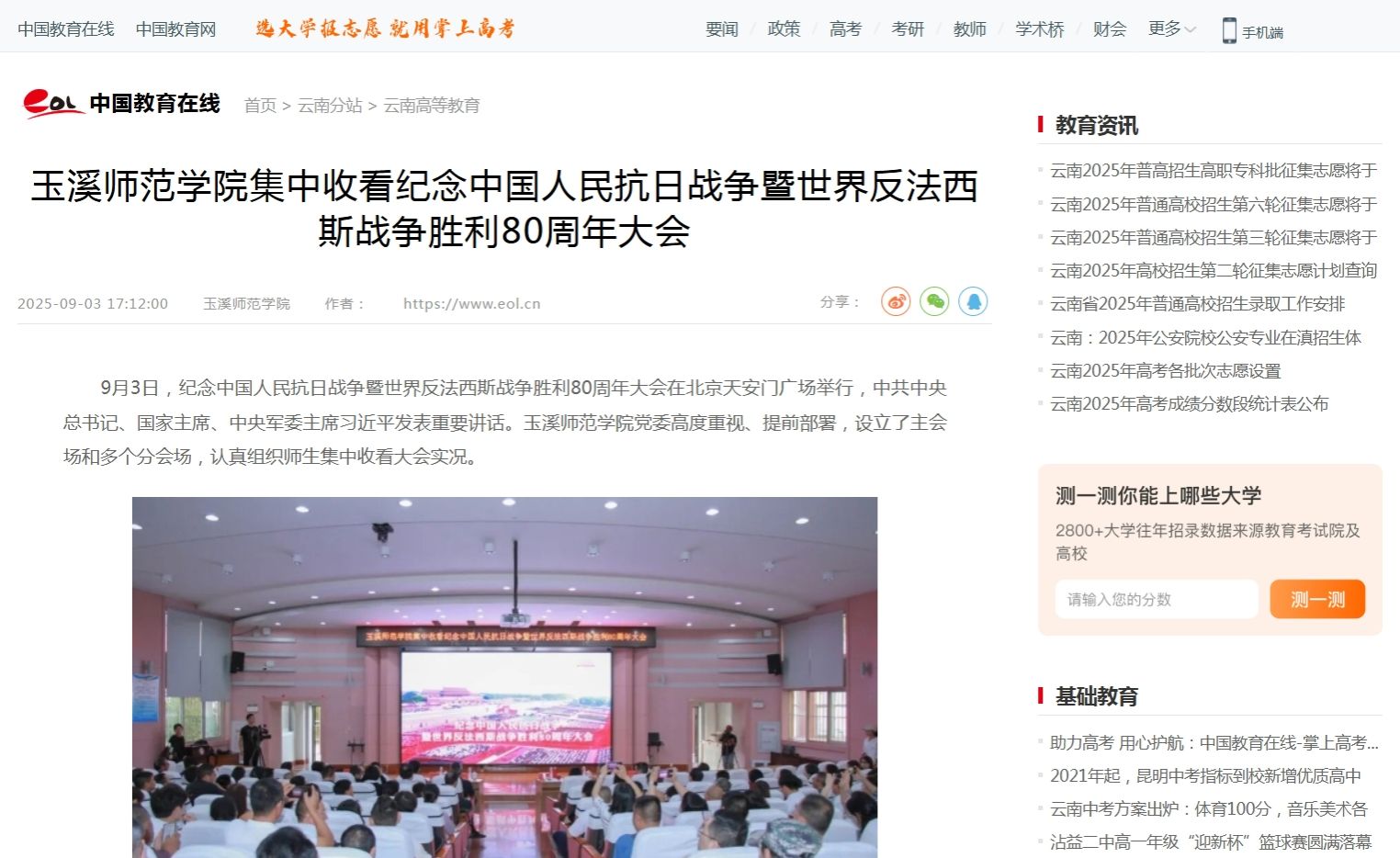 9月3日,纪念中国人民抗日战争暨世界反法西斯战争胜利80周年大会在北京天安门广场举行,中共中央总书记、国家主席、中央军委主席习近平发表重要讲话。玉溪师范学院党委高度重视、提前部署,设立了主会场和多个分会场,认真组织师生集中收看大会实况。