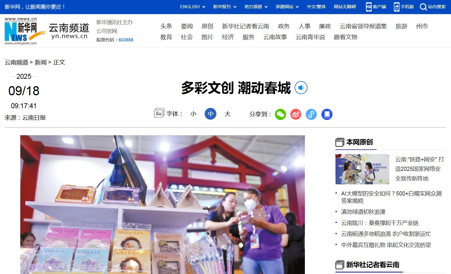 在中国日报展区,“CHINA DAILY”与云南元素的融合无处不在,其中不乏“滇韵”挂耳咖啡以及印有绿孔雀图案的芳香贴。“芳香贴基于‘有一种叫云南的生活’IP打造,气味清新,具有中医药保健作用。”展台负责人何渝介绍,“云南不仅好吃、好玩,更有好闻的特色文创,希望游客也将云南的气味带回家。”