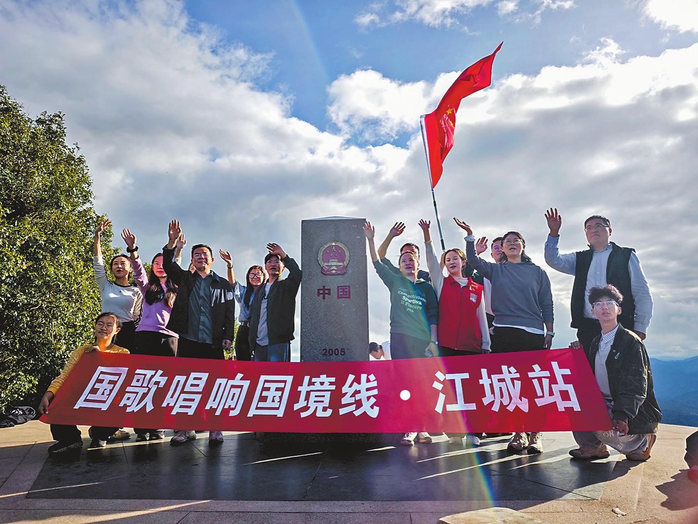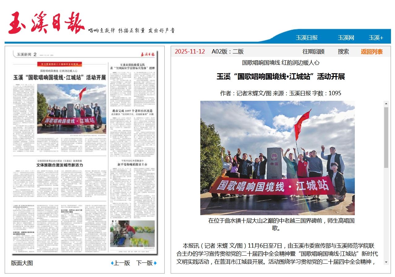 本报讯(记者 宋蝶 文/图)11月6日至7日,由玉溪市委宣传部与玉溪师范学院联合主办的学习宣传贯彻党的二十届四中全会精神暨“国歌唱响国境线·江城站”新时代文明实践活动,在普洱市江城县开展。活动围绕学习贯彻党的二十届四中全会精神,以铸牢中华民族共同体意识为核心,通过红色宣讲、推普教学、文化交流、齐唱国歌等多元形式,让激昂的国歌声传至国境线,让红色文化的韵味温暖边疆人民的心,为“兴滇润边新时代文明实践带”建设注入了青春活力。