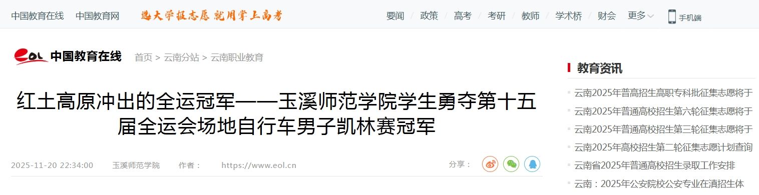 11月17日,在中华人民共和国第十五届全国运动会场地自行车男子凯林赛决赛中,玉溪师范学院体育教育专业学生解涵表现亮眼,以出色的爆发力与冷静的战术执行,勇夺金牌。这枚金牌不仅是云南省在全运会场地自行车短距离项目上的首枚金牌,也是玉溪市培养输送运动员在本届全运会上收获的首金,具有里程碑意义。