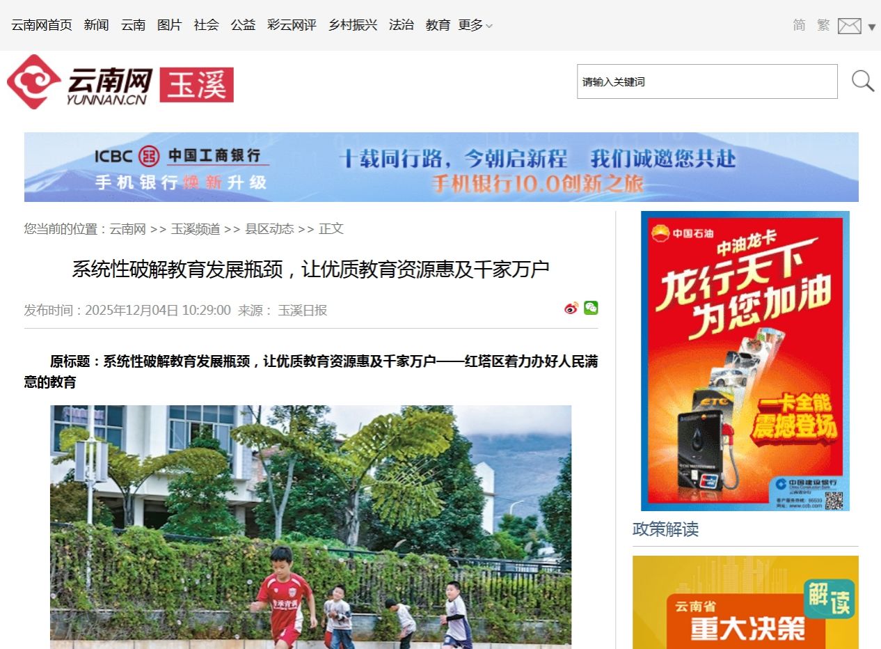 教育是国之大计、党之大计,承载着万千家庭的期盼。近年来,红塔区锚定“办好人民满意的教育”目标,秉承“有教无类”育人理念,以体制机制创新为突破口、资源均衡配置为着力点、五育并举实践为育人根基,系统性破解教育发展瓶颈,深层次重塑区域教育生态,推动教育高质量发展。作为云南省首批、玉溪市首个全国义务教育优质均衡发展县(区),红塔区的探索实践不仅让优质教育资源惠及千家万户,更为县域教育改革提供了红塔区样本。