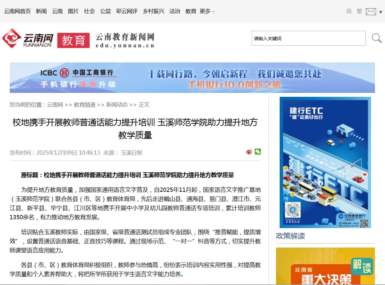 为提升地方教育质量,加强国家通用语言文字普及,自2025年11月起,国家语言文字推广基地(玉溪师范学院)联合各县(市、区)教育体育局,先后走进峨山县、通海县、易门县、澄江市、元江县、新平县、华宁县、江川区等地携手开展中小学及幼儿园教师普通话专项培训,累计培训教师1350余名,有力推动地方教育发展。