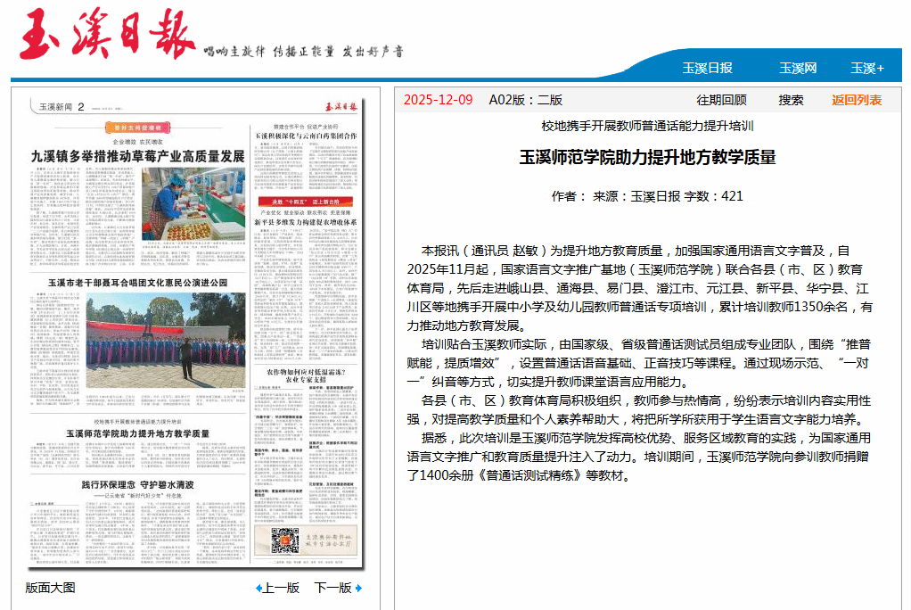 本报讯(通讯员 赵敏)为提升地方教育质量,加强国家通用语言文字普及,自2025年11月起,国家语言文字推广基地(玉溪师范学院)联合各县(市、区)教育体育局,先后走进峨山县、通海县、易门县、澄江市、元江县、新平县、华宁县、江川区等地携手开展中小学及幼儿园教师普通话专项培训,累计培训教师1350余名,有力推动地方教育发展。