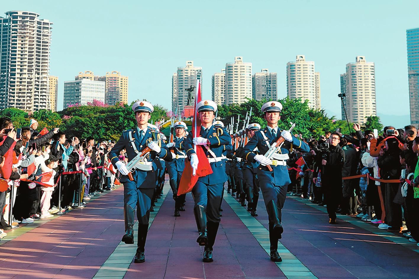 玉溪消防聂耳广场国旗护卫队护送五星红旗走向升旗台。
