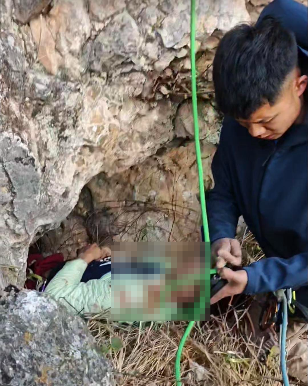 经了解,两名攀岩者为一男一女,年龄23岁,两人放绳下降阶段绳索卡入岩缝。男方试图通过攀岩方式接近岩缝,在此过程中不慎产生冲坠和摆荡,导致头部及手肘受伤、短暂昏迷、意识不清、无行动能力;女方相对状态良好。两人位于一处近乎垂直的石灰岩峭壁中段处,岩壁崎岖湿滑、碎石遍布,救援环境极其复杂、风险极高。