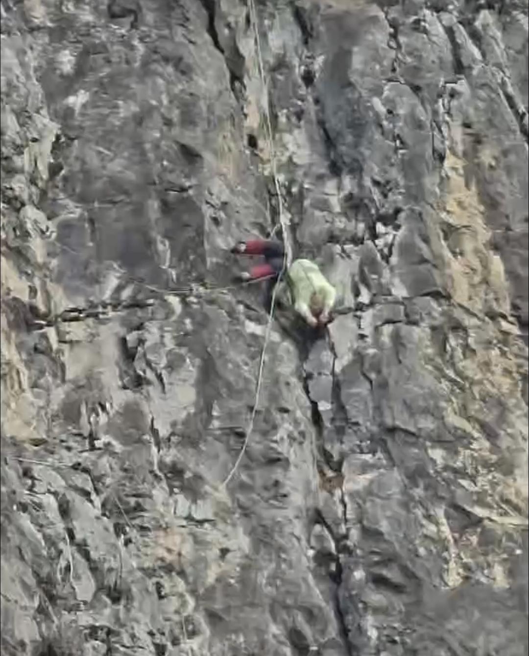 赵海呈回忆,就在他们关注到攀岩者时,其中一人突然发生冲坠和摆荡,其中一次摆荡导致其手臂撞击崖壁,第二次摆荡导致其头部撞击崖壁后失去行动能力,倒挂在悬崖之上。“我们发现险情后马上大声呼喊,可能因为风太大,他们似乎没有听到我们的呼喊声。”赵海呈说,他们赶紧跑到距离两人最近的地方。