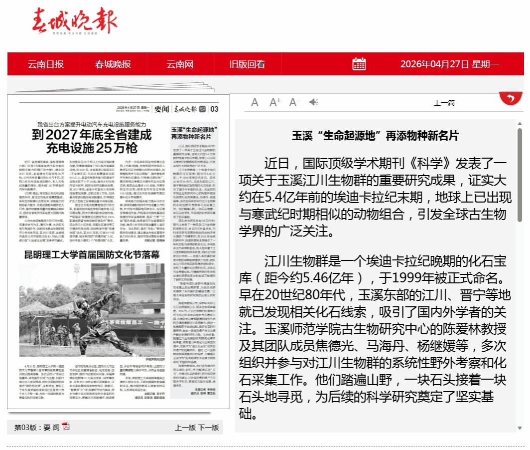近日,国际顶级学术期刊《科学》发表了一项关于玉溪江川生物群的重要研究成果,证实大约在5.4亿年前的埃迪卡拉纪末期,地球上已出现与寒武纪时期相似的动物组合,引发全球古生物学界的广泛关注。