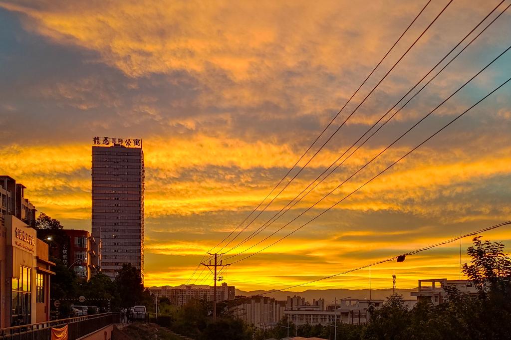 在大学生活动中心楼顶,看天空逐渐被夕阳染成金黄。