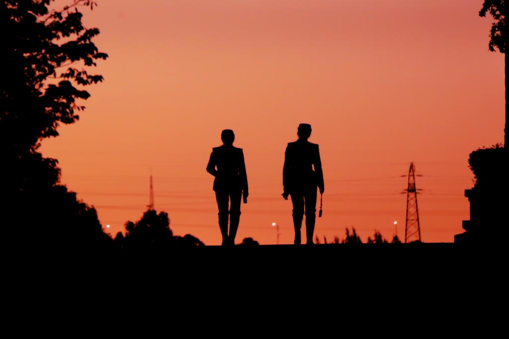 日落黄昏,华灯初上,灯光如星,两人成影。