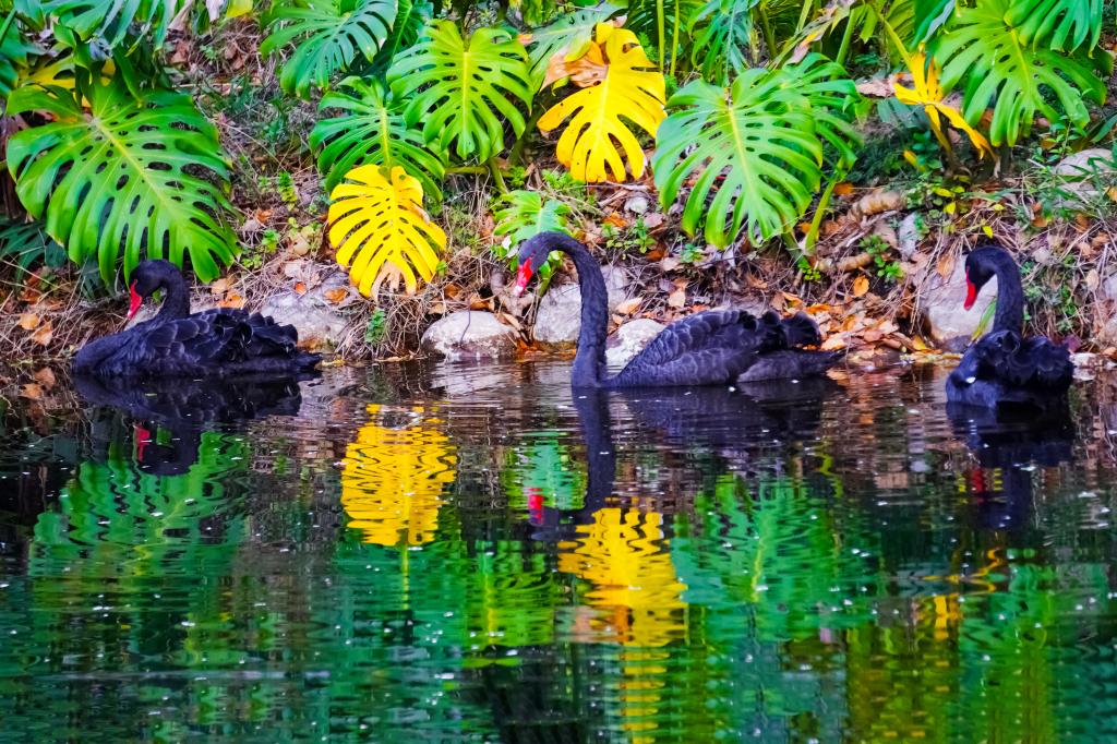 寓意美丽吉祥、忠诚永恒的黑天鹅在怡心谭惬意栖居,形成一道隽秀灵动的风景。