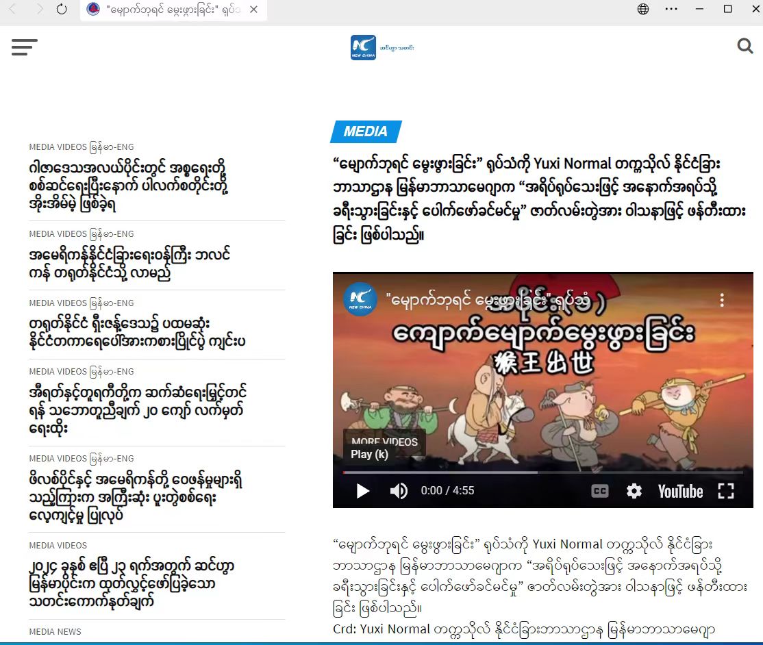 在“一带一路”建设和云南面向南亚东南亚辐射中心建设的背景下,为讲好中国故事,传播好中国声音,加强中国优秀文化国际传播力,推动文化交流互鉴,玉溪师范学院外国语学院缅甸语专业师生发挥专业优势,制作“皮影说西游,情义系胞波”系列视频《猴王出世》,该视频在社交平台发出后,引起广泛关注,并于2024年4月23日被新华社缅文平台转载。