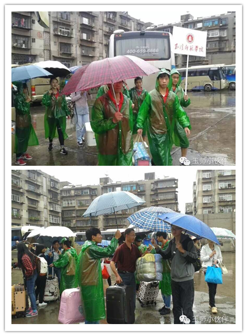 26日上午突降大雨,迎新工作人员和志愿者冒雨接待新生及家长,送出了初秋的温暖。