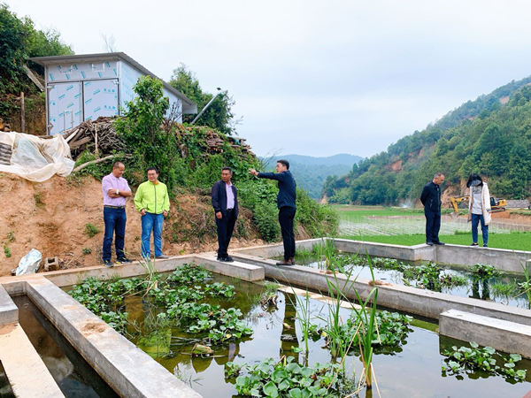 在大摊子组人居环境整治提升示范村项目现场,大家重点走访调研了新竣工的生活污水处理池的运转效果,并向承建方负责人孙崇发先生详细询问了相关建设情况,当场还进行了激烈的探讨,计划回去后在最短时间之内由叶长兵教授、赵静博士和周志明总经理共同负责向小街街道扶贫办无偿提交一份改造提升技术方案。