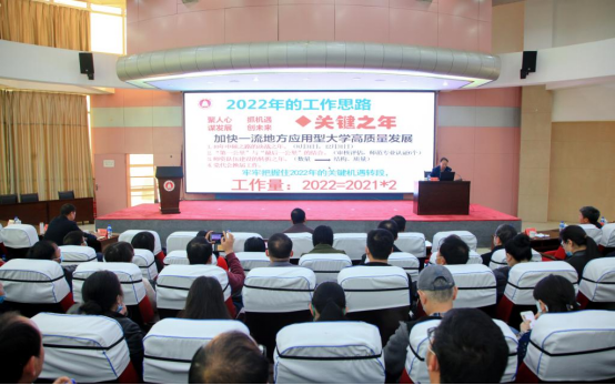 马力总结了学校2021年的主要成绩和工作亮点,分析了2022年面临的机遇与挑战,对2022年重点工作作了部署安排。马力强调,2022年,要重点做好党建工作,疫情防控常态化开学和教学工作,毕业生就业工作、申硕冲刺工作、师范专业认证与专业建设工作、审核评估试点迎评促建工作、校园安全与后勤改革工作等,努力聚人心、抓机遇、谋发展、创未来,加快一流地方应用型大学高质量发展。