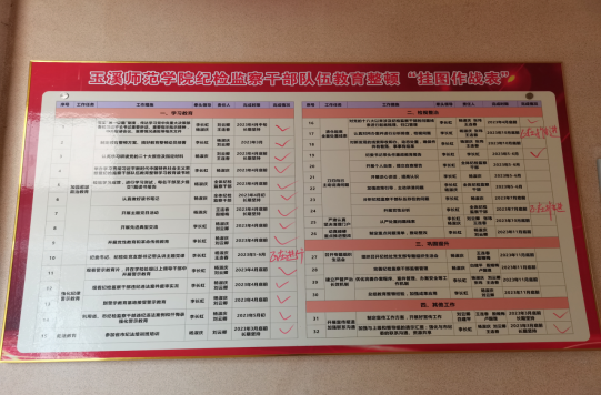 在开展各项工作过程中,学院纪委多措并举,出新招、抓重点、见成效。一是采取“挂图作战”推进工作落实。一幅“作战图”,明明白白挂在墙上,明确任务目标、工作措施、完成时限,责任细化到人,每周一,部门开展学习活动时,每一名纪检干部都会自觉观看墙上的作战图,看看自己上一周的工作完成情况,查缺补漏。“作战图”挂在墙上,每周进行动态更新,推进各项工作按时有序完成。二是