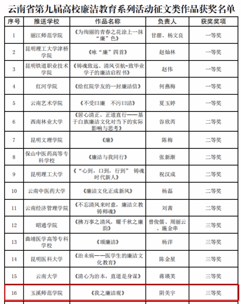 12月17日,由云南省教育工委主办的云南省第九届高校廉洁教育系列活动评选结果公布,玉溪师范学院选送的师生作品在此次活动中获二等奖1项、三等奖2项。
