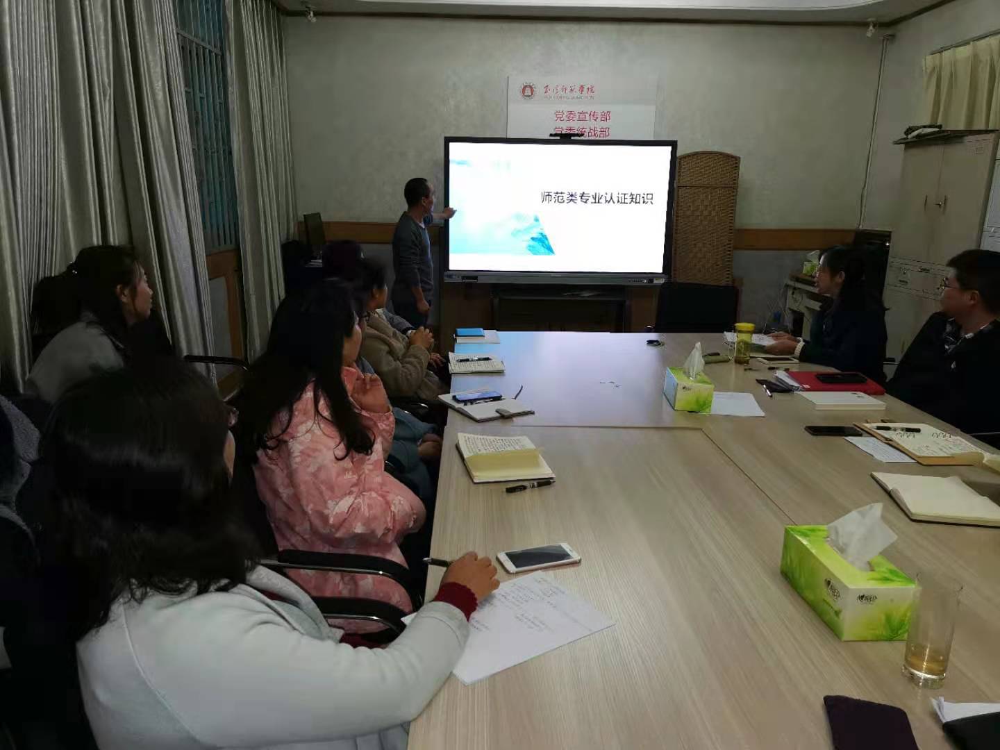 为配合做好学校师范专业认证专家进校考察期间的工作,进一步加强人事处全体教职员工对师范专业认证知识的认识和理解,2021年10月22日下午,人事处在一办212会议室进行了师范专业认证知识的专题培训,全体人员参加了培训会。