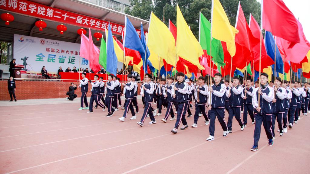 伴随着激昂的进行曲,国旗护卫队、校旗护卫队、本届运动会吉祥物、彩旗队、荣誉代表队、裁判员方队和各学院运动员代表队依次经过主席台,嘹亮的口号,铿锵的脚步,蓬勃的面孔,烂漫的笑容,生动展现了玉师学子们雄姿英发、昂扬向上的青春风采。