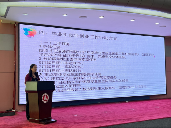 会上,学生处副处长宋树兵对截至4月12日我校毕业生去向落实率、各学院毕业生去向落实率、各专业毕业生去向落实率进行了详细通报,并对2021届毕业生就业创业工作任务清单做相关解读。