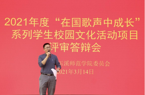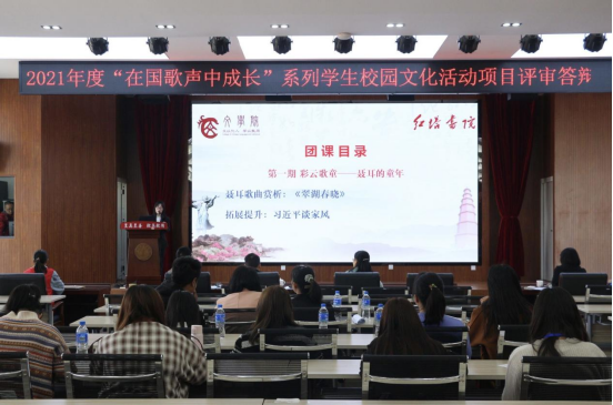 为全面落实习近平总书记关于青年工作和高校教育教学改革的重要讲话精神,推进学校一流地方应用型大学建设,繁荣校园文化,打造校园文化精品,培养德智体美劳全面发展的时代青年,由校团委组织开展的2021年度“在国歌声中成长”大学生校园文化活动项目评审答辩会于3月14日在大学生活动中心学生会堂举行。校团委书记罗辉,组织部副部长周明,学生处副处长廖峰,校团委副书记余家赛、张远、李峰宇,宣传部精神文明办公室主任万景,教务处教学实践科负责人文萍担任评审答辩会评委,各学院团委书记、项目指导教师、项目负责人和学生代表等参加答辩会。