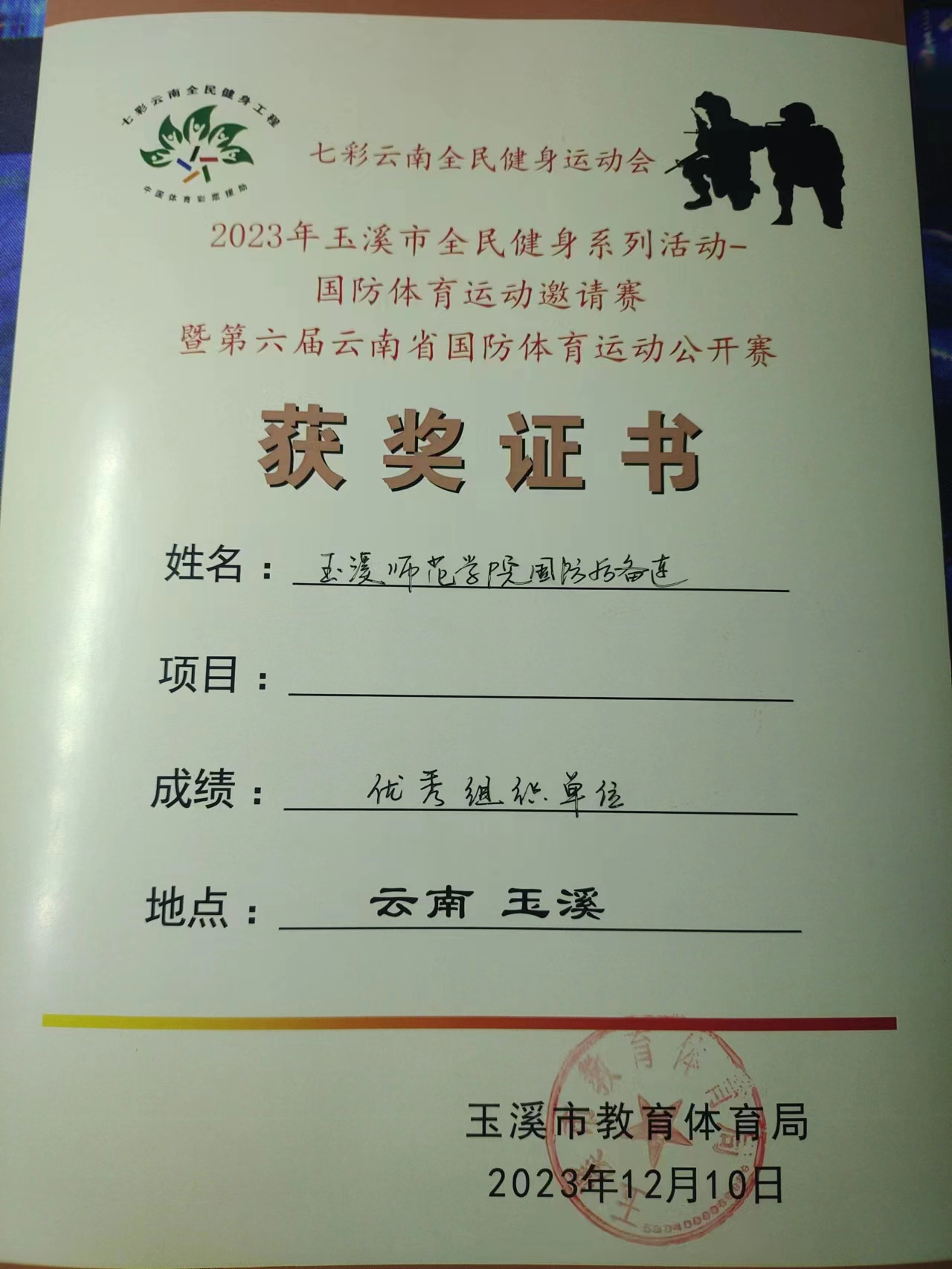 2023年12月8-10日,我校代表队在玉溪市高原体育运动中心开展的“2023年玉溪市全民健身系列活动-国防体育运动邀请赛暨第六届云南省国防体育运动公开赛”中展现出学生的团队协作能力和竞技水平,在比赛中取得优异的成绩。