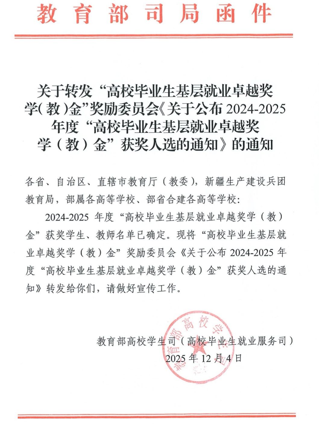 12月4日,教育部公布2024—2025年度“高校毕业生基层就业卓越奖学(教)金”获奖名单,玉溪师范学院学生就业指导中心专职辅导员杨明秋荣获“高校毕业生基层就业卓越奖教金”。该奖项由教育部高校学生司等部门指导、中国教育发展基金会设立,经严格遴选,本年度全国高校仅58名教师获此殊荣。