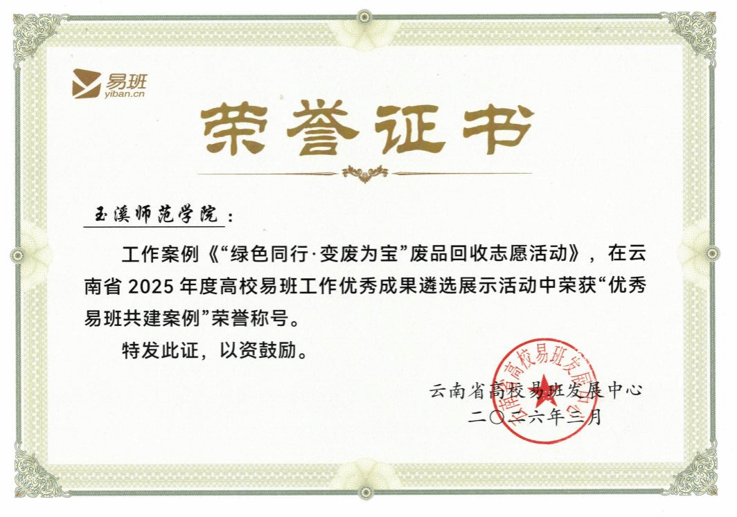 我校被评为2025年度云南省 “十佳易班共建高校”;学校易班工作案例《绿色同行・变废为宝废品回收志愿活动》获评“云南省优秀易班共建案例”;辅导员肖粒老师荣获“云南省优秀易班辅导员”称号;学校易班学生工作站站长王公恋同学荣获“云南省优秀易班工作站站长”称号。