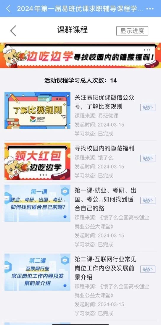 在易班优课中根据邀请码(4LZ6MHH5)添加课群“2024年第一届易班优课求职辅导课程学习大赛”,按各自学院加入对应的学习小组并完成相应的视频学习任务。