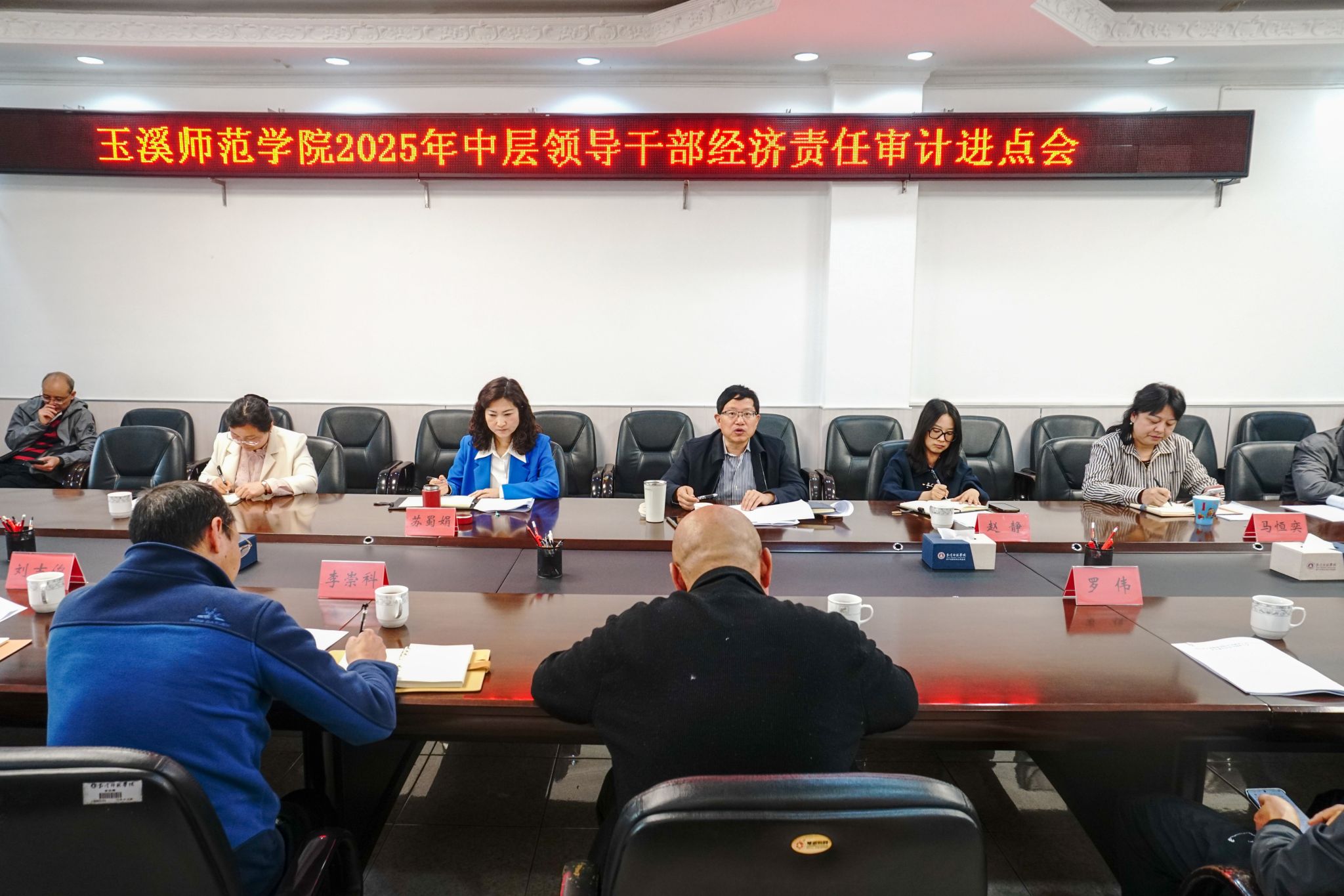 4月11日上午,玉溪师范学院2025年中层领导干部经济责任审计进点会在一办一楼会议室召开。校党委委员、副校长章新,被审计领导干部,组织部、被审计单位党政主要负责人,审计处全体人员参加会议。会议由审计处处长苏蜀娟主持。