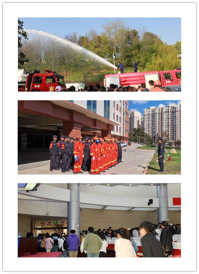 保卫处在品味苑门前及模拟灭火现场放置消防知识宣传展板。邀请玉溪市红塔区消防大队参谋法青林到校进行消防知识讲座,讲述了专业消防安全知识、火灾逃生自救常识及分析火灾案例。