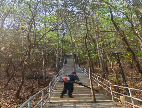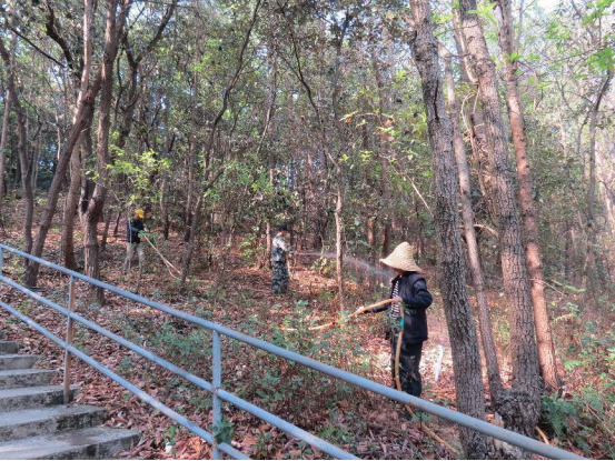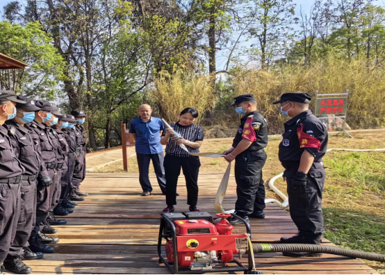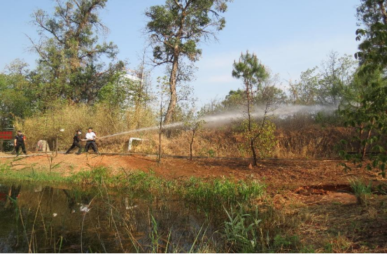 上午9点整,随着演练指令的发出,校卫队员紧急集合,携带森林火险扑救器材,迅速从山顶平台出发,按照演练方案开始演练。校卫队员熟练运用风力灭火器清理防火带,用橡胶打火拖把快速有序地扑灭火源,用抽水机抽出湖水扑灭火点;后勤服务中心绿化人员对林区内堆积的枯枝败叶等可燃物进行喷灌作业。应急演练持续了近两个小时,整个过程紧张有序,充分展示了后勤安保人员快速反应、协调配合和应急实战技巧。