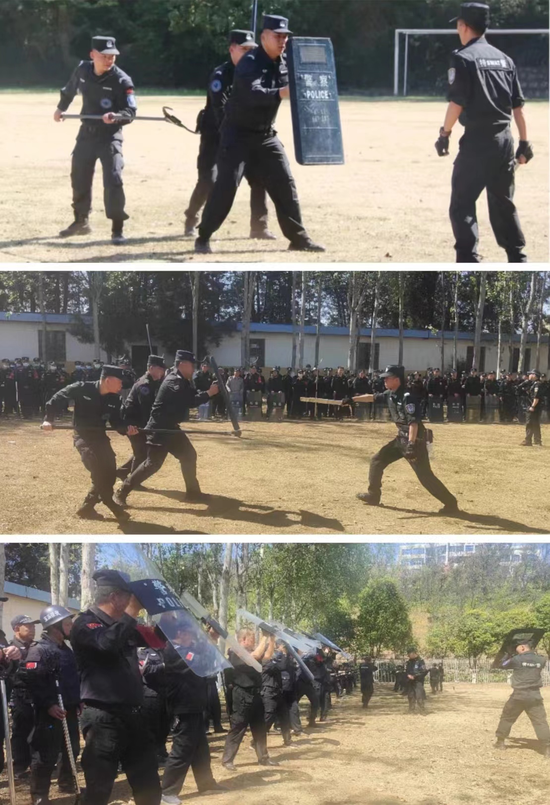 玉溪市公安局红塔分局红塔山派出所警务实战教官和特邀玉溪市公安局红塔分局巡特警大队警务实战教官,分别从安保人员装备器械使用讲解和实战演练、最小作战单元基础培训(器械使用、小组配合)、校园突发事件处置警校融合勤务协作场景模拟演练三个方面进行了培训。