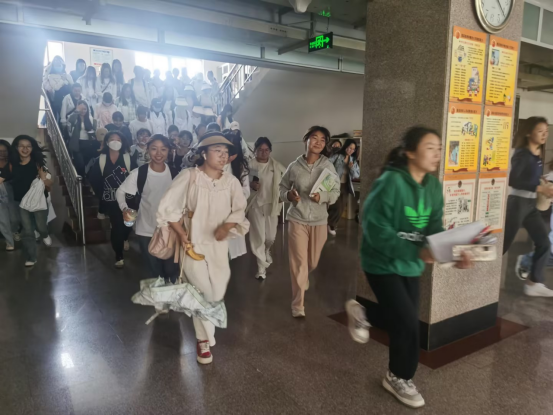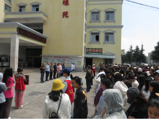 13点20分,伴随着疏散哨声的响起,住B、C幢的化生环、商学院、外国语学院、体育学院、美术学院和音乐学院的2200余名学生按照就近疏散、有序疏散的原则,在宿舍管理员、辅导员、志愿者和校卫队的引导下,快速有序的撤离宿舍,在品味苑广场前按学院集合,清点人数,检查是否有学生遗漏或受伤,整个过程紧张而有序。