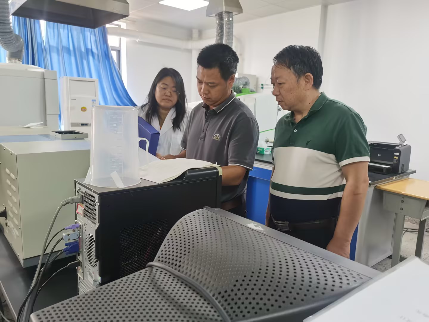 李长虹一行重点对实验室安全管理、仪器设备运行使用、危险化学品存放、各类台账资料及配电房安全运行情况进行检查。