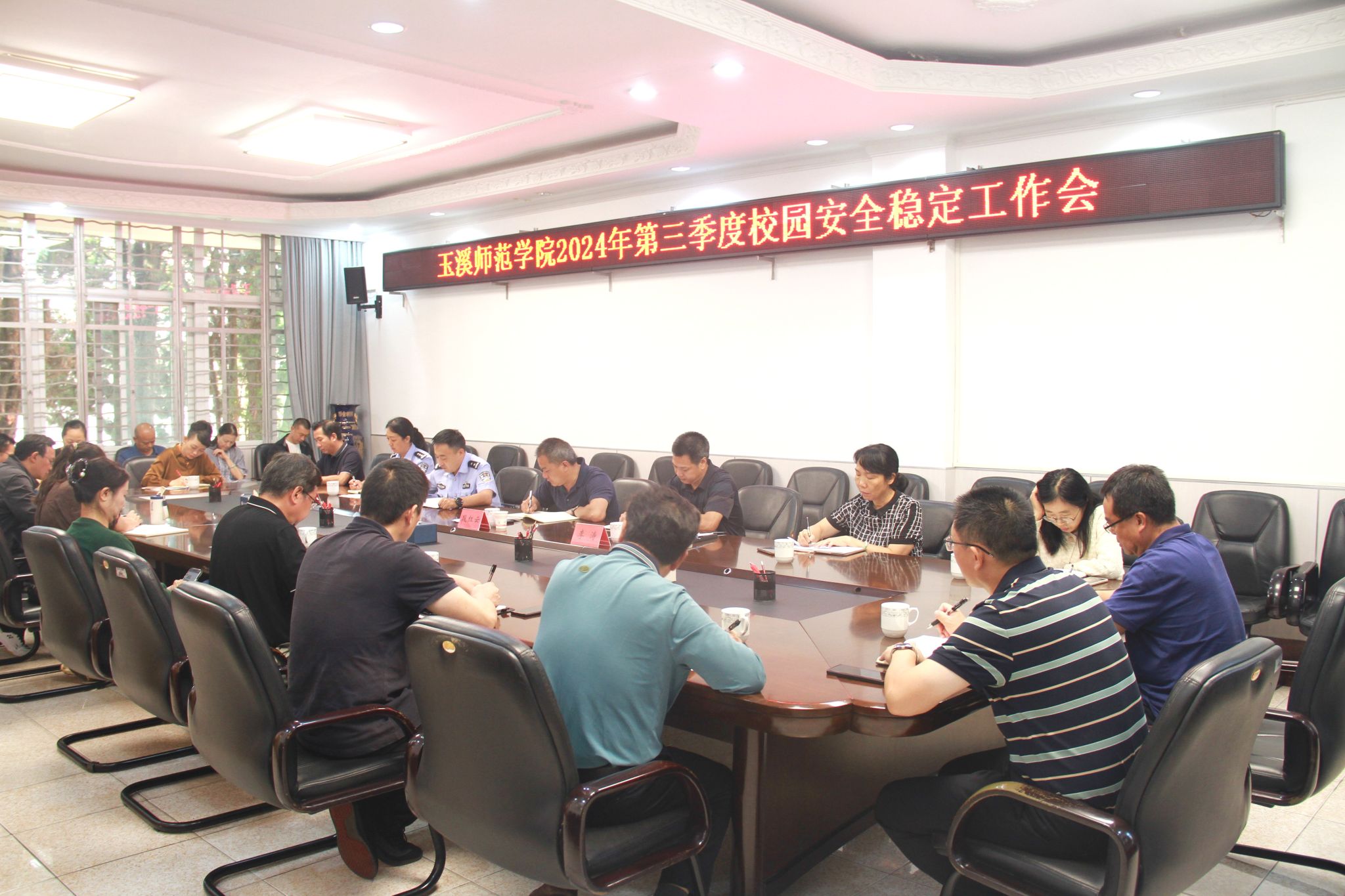 9月26日上午,玉溪师范学院在一办一楼会议室召开2024年第三季度校园安全稳定工作会。党委副书记、校长段红云,党委委员、副校长李涛,玉溪市公安局红塔山派出所所长曾祥及片区民警,各学院党委书记、相关部门负责人参会,会议由李涛主持。
