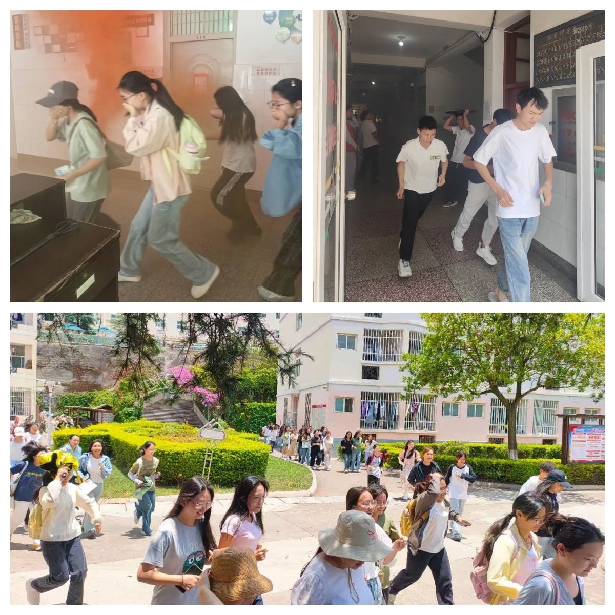 中午13时许,李涛发出演练开始指令,学生宿舍3栋、公寓C幢释放烟雾弹模拟突发火险,其他楼栋模拟突发地震灾害。各楼栋宿管员吹响疏散哨声,师生快速进入应急状态,按照疏散方案逃生路线从各自宿舍有序紧急撤离到指定的安全地点。