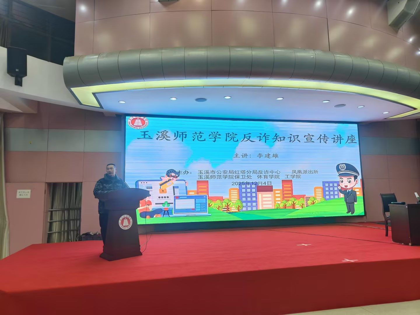 1.持续开展防范电信诈骗系列宣传,联合玉溪市公安局红塔分局反诈中心、凤凰派出所、工学院、体育学院,在图书馆多元学术厅开展玉溪师范学院反诈知识宣传讲座,500余名学生参加;联合派出所走访学生社区,深入宿舍开展反诈宣传教育;筛查在校学生安装国家反诈APP情况并统计上报。