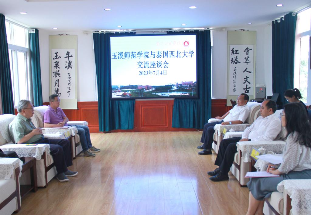 7月4日,泰国西北大学校长助理马如宝、驻云南办事处教师郑昊到玉溪师范学院访问交流。双方围绕教师学历提升、学生本升硕项目和师生互换交流等项目合作事宜,在三元楼201会议室举行交流座谈。