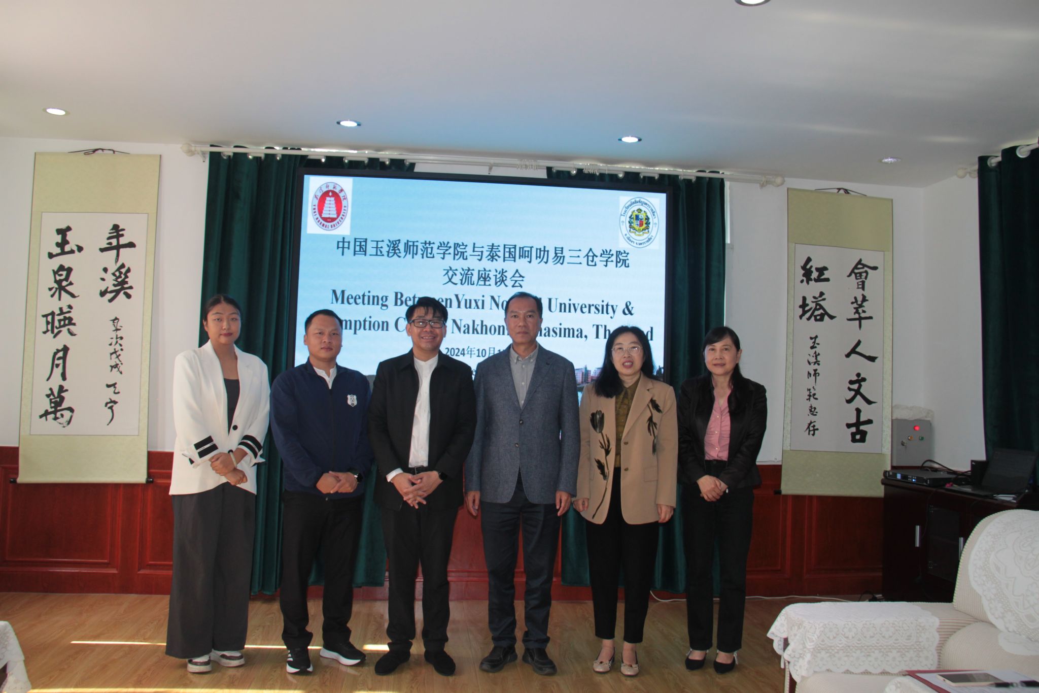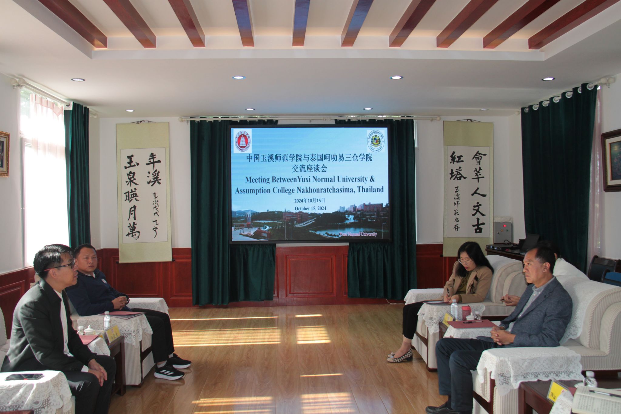 10月15日上午,泰国呵叻易三仓学院院长威塔亚·特普孔、中文部负责人孙贵学到校访问交流,座谈会在三元楼201会议室召开。学校党委副书记张亚辉、对外合作交流处处长杨春、副处长吴晓颖参加了交流座谈。