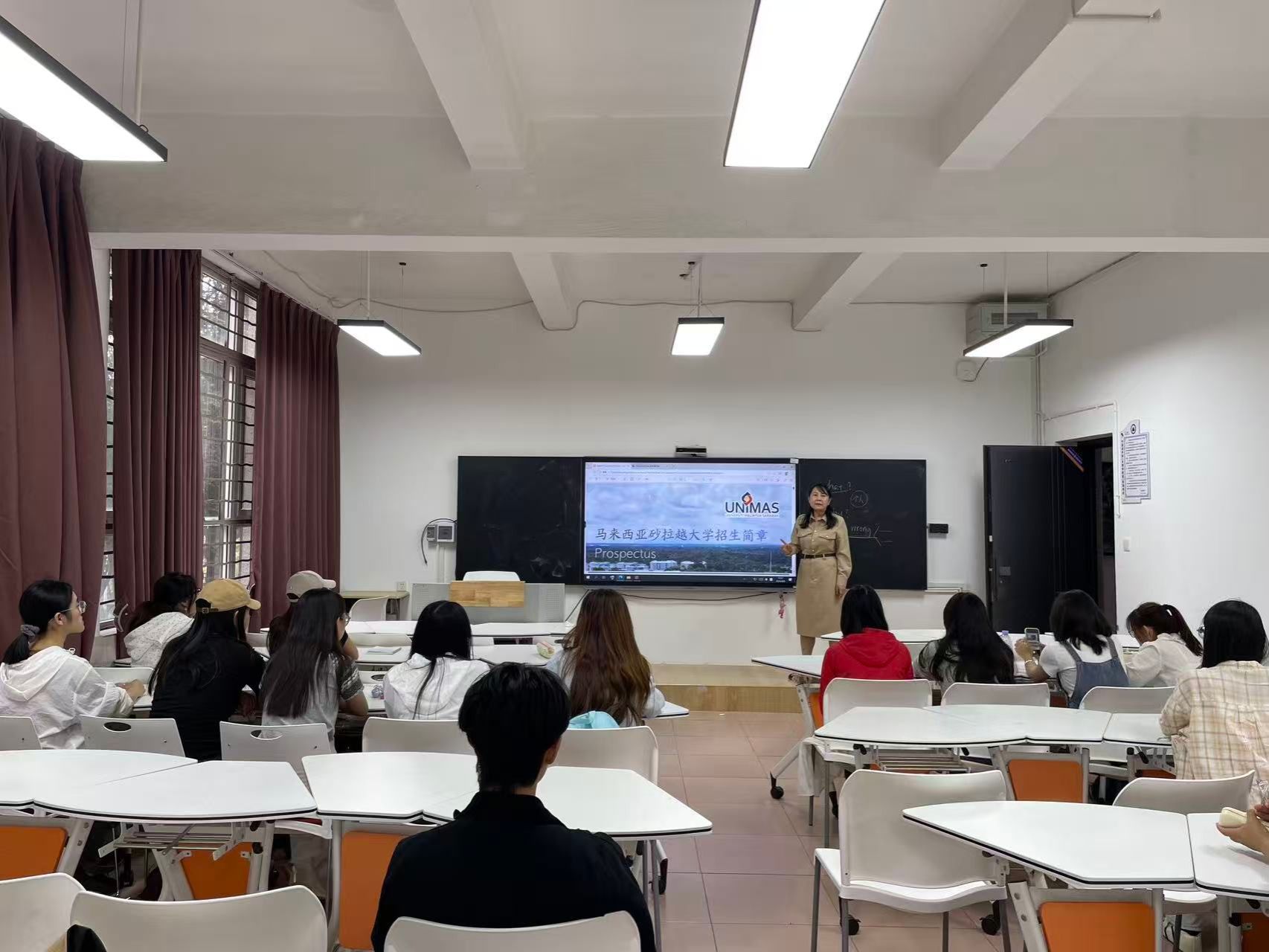 对外合作交流处吴晓颖副处长围绕三个项目进行了系统讲解。她指出,随着RCEP成员国之间人员流动与教育合作不断深化,东南亚国家对我校复合型、应用型外语人才的需求持续增长。她详细介绍了赴马来西亚砂拉越大学升硕项目的申请条件、学制安排、课程设置及毕业发展方向;随后,就赴印尼和泰国的带薪实习项目,从实习岗位类型、当地实习单位待遇、语言能力要求、安全保障及项目运行情况等方面作了细致说明,鼓励同学们抓住RCEP框架下区域教育合作与人文交流的有利时机,积极“走出去”提升自身竞争力。